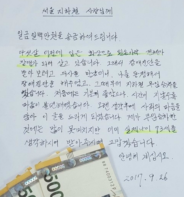 손편지를 보낸 70대 노인은 이 점이 마음에 걸려 조금이나마 보답하고자 100만원을 서울교통공사 측에 보낸 것으로 추정됩니다.