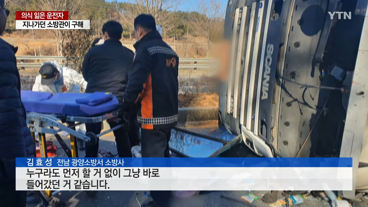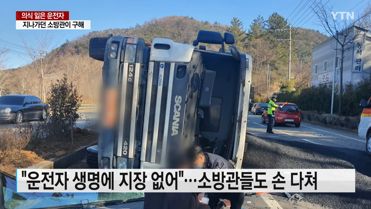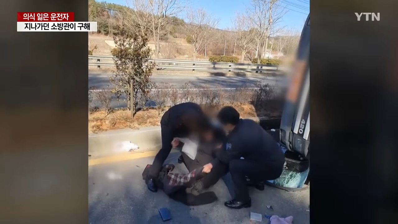 두 사람은 처음엔 차 안에 아무도 없는 줄 알고 교통정리를 하기 위해 현장으로 다가갔습니다. 그러나 트럭 안에는 50대 운전자가 피를 흘린 채 의식을 잃고 쓰러져 있었습니다.