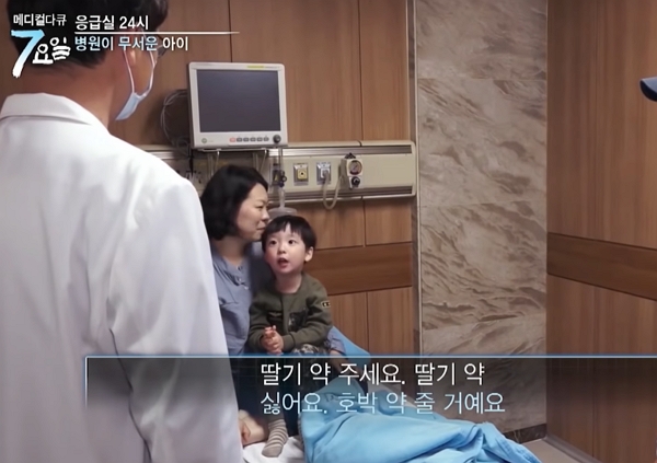 서진이는 “의사 선생님! 딸기약 주세요, 딸기약!”이라고 해맑게 외쳤다. 그러자 담당 의사는 “싫어요! 호박약 줄 거예요”라며 농담을 던진 뒤 유유히 현장(?)을 빠져나갔습니다. 호박약이라는 말에 서진이는 또 울상이 됐습니다.
