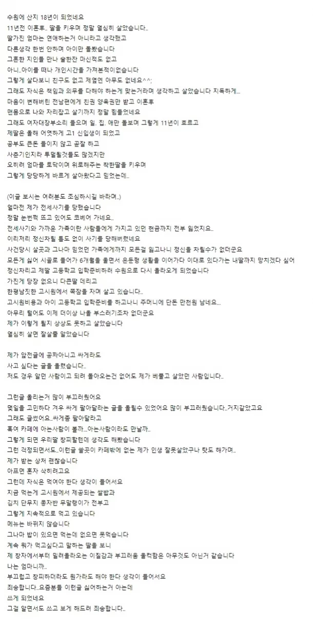 잠시 시골로 갔다가 딸의 고등학교 입학을 위해 수원으로 돌아온 모녀는 한 평 남짓한 고시원 생활을 시작했고, 지역 맘 카페에 생활고를 알렸습니다.