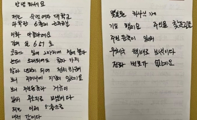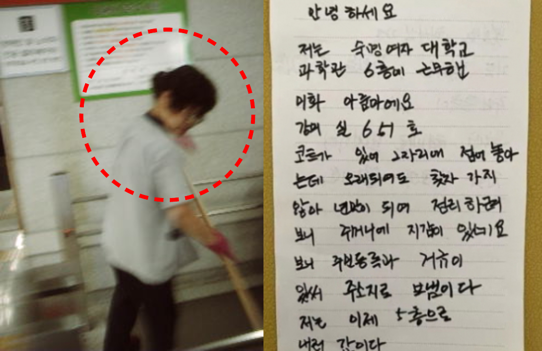 편지에는 “안녕하세요. 저는 숙명여대 과학관 6층에서 근무한 미화 아줌마예요”라고 적혀있었습니다. 편지를 작성한 사람은 숙명여대에서 근무하는 미화 직원 B씨였습니다.