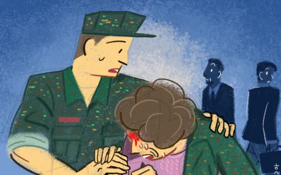 정 일병은 곧장 할머니에게 달려갔습니다. 할머니의 상태를 물어보고 지혈을 했습니다. 119구조대에 전화를 건 뒤 구조대원들이 오기 전까지 할머니의 상태를 살폈습니다.