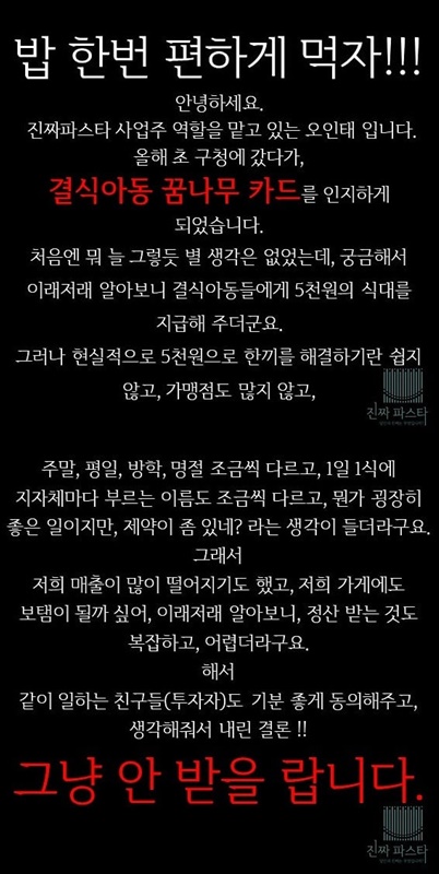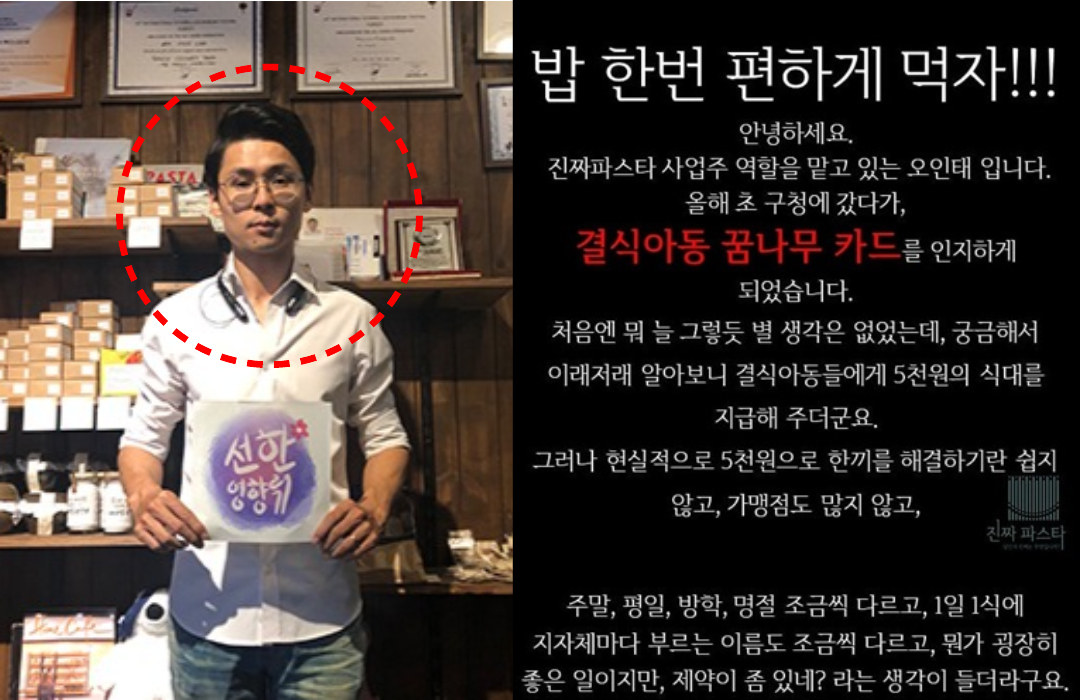 ‘진짜파스타’를 운영 중인 오인태 사장은 “올해 초 구청에 갔다가 결식아동 꿈나무 카드를 알게 됐다”고 했습니다.
