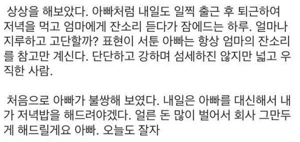 또 “상상을 해보았다. 아빠처럼 내일도 일찍 출근해서, 퇴근하고 저녁을 먹고, 엄마에게 잔소리를 듣다가 잠에 드는 하루. 얼마나 지루하고 고단할까? 표현이 서툰 아빠는 항상 엄마의 잔소리를 참고만 계신다”고 전했습니다.
