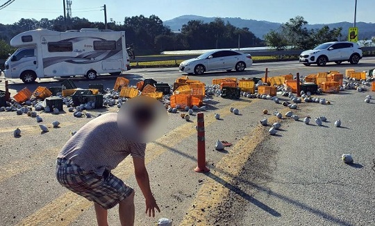 19일 경기 안성시 한 도로에서 이런 일이 있었습니다. 오후 4시쯤 중부고속도로 일죽 톨게이트 진입로 부근에서 A씨가 몰던 화물차가 좌회전을 하다가 중심을 잃으면서 짐칸에 실린 배 상자 수십 개가 도로로 떨어진 것이죠.