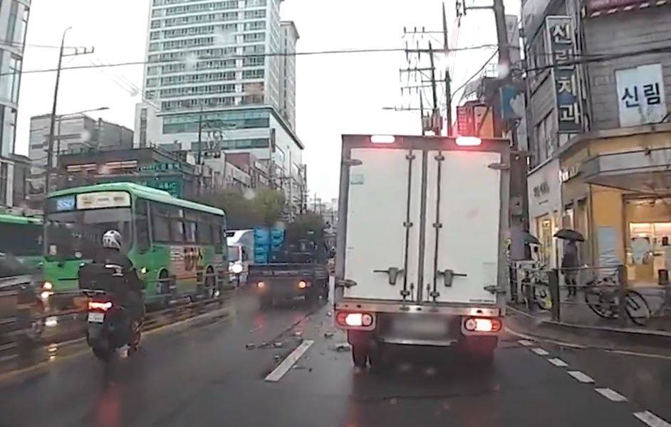 지난 19일 오전 11시 30분쯤 서울 신림역사거리에서 좌회전하던 주류배달 트럭 적재함에서 상자 하나가 도로 위에 떨어졌습니다. 이때 상자 안에 있던 공병들이 쏟아지면서 깨진 유리 파편이 여기저기 바닥에 흩어졌습니다.