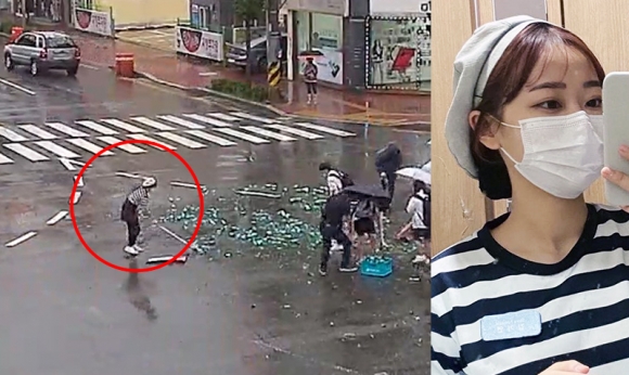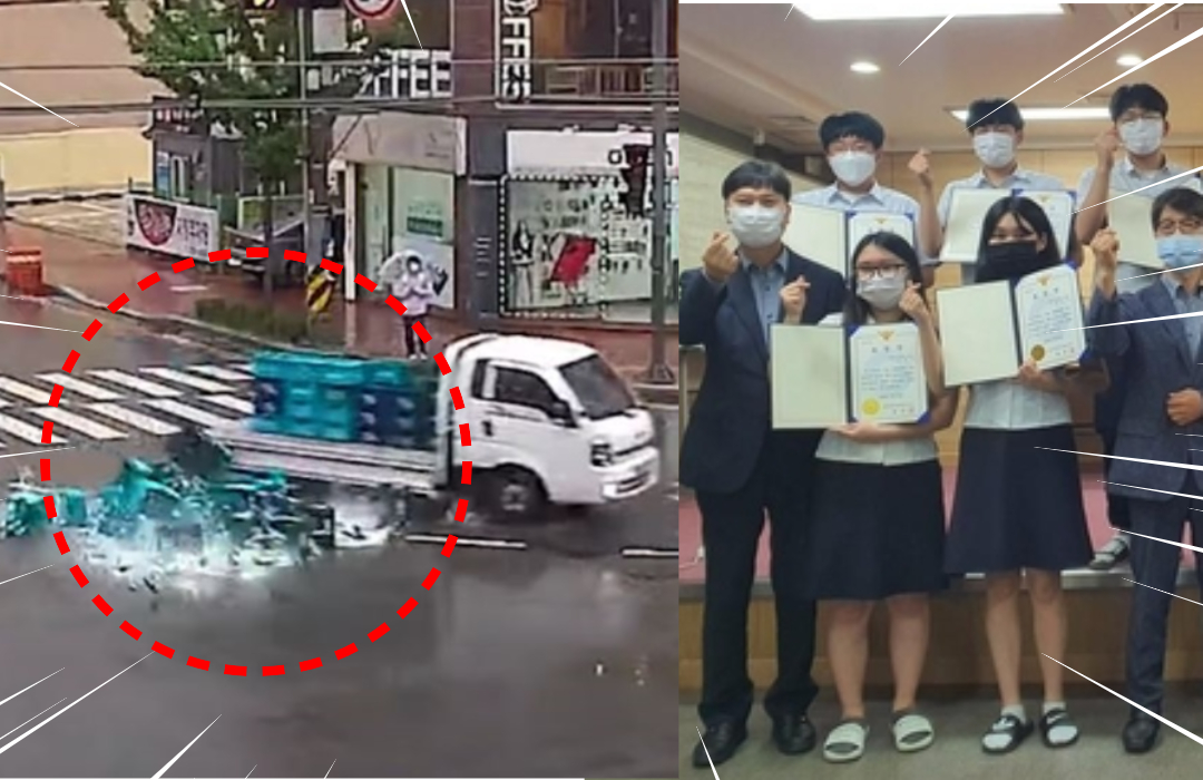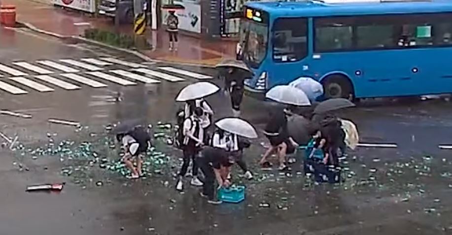 비가 내리는 궂은 날씨였기에 트럭기사 혼자 유리 파편이 가득한 도로를 치우기에는 역부족이었습니다. 그때, 학생들이 주저 없이 사고 현장으로 뛰어와 트럭기사를 돕기 시작했습니다.