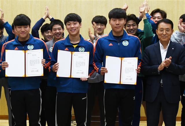 지난 1일 오후 4시쯤 강원 춘천시 송암동 의암호에서 물에 빠진 50대 여성 운전자를 구조해낸 강원체육고등학교 수영부 학생들. 왼쪽부터 김지수(19)·성준용(19)·최태준(19) 학생.