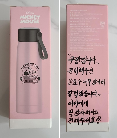 문 앞에 쪼그만 핑크색의 무언가가 놓여 있었던 거죠. 아이들이 좋아할 만한 미니마우스 캐릭터의 보온병에는 딸 아이를 향한 기사님의 답장이 적혀 있었습니다.