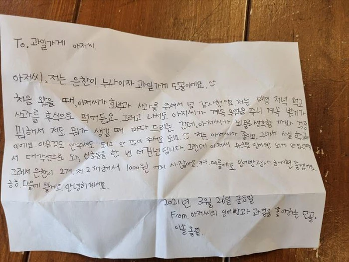 아이들의 눈은 솔직해서 가장 정확하다고들 합니다. 기특한 꼬마 손님도 사장님의 진심을 누구보다 잘 느꼈기에 그렇듯 따스한 편지를 전했을 겁니다. 사장님과 꼬마 손님의 행복한 인연이 계속되길 기대하며 우리 주변에 숨은 천사들이 더욱 많아지길 응원해봅니다.