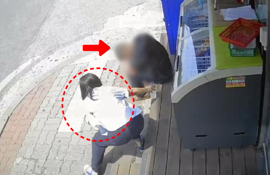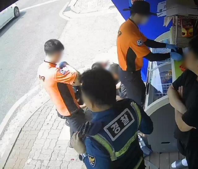 그러나 여성이 물을 놓고 간 지 30초도 지나지 않아 남성은 갑자기 바닥으로 쓰러졌습니다. 여성은 곧바로 편의점으로 들어가 도움을 요청했습니다.