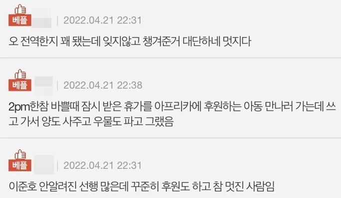 이에 네티즌들은 “전역한 지 꽤 됐는데 잊지 않고 챙겨준 거 대단하다, 멋지다”, “2PM 한창 바쁠 때 잠시 받은 휴가를 아프리카에 후원하는 아동 만나러 가는 데 쓰고, 가서 양도 사주고 우물도 팠다”, “이준호 안 알려진 선행 많은데 꾸준히 후원도 하고 참 멋진 사람이다”,